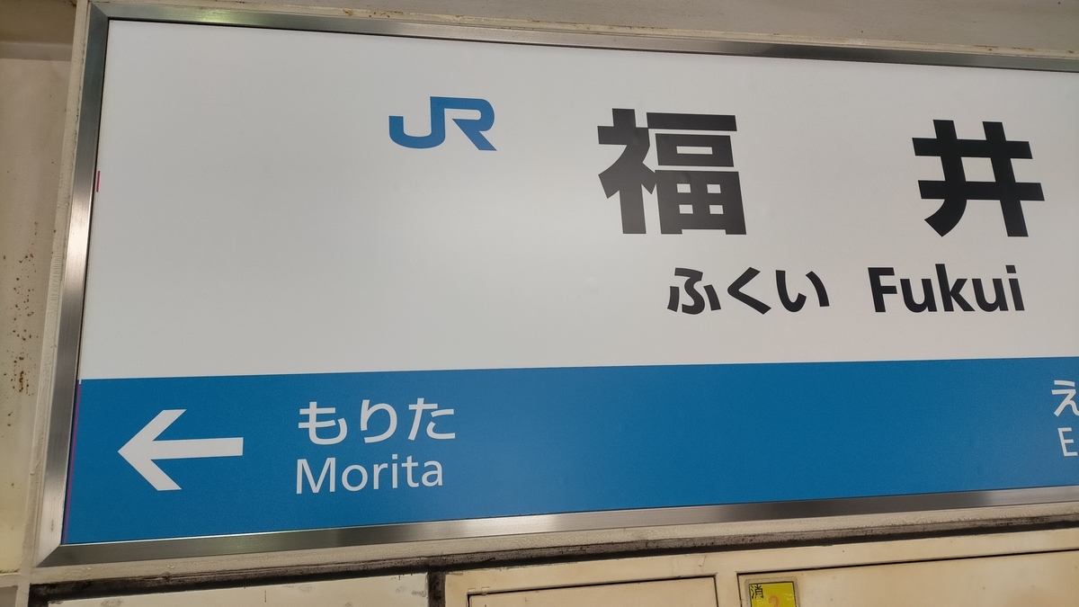 福井には3分程度で到着しました。福井駅の駅名標、ハピラインの駅名標が下にちらっと隠れています